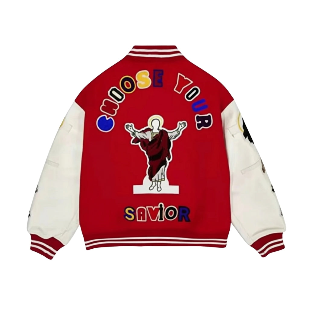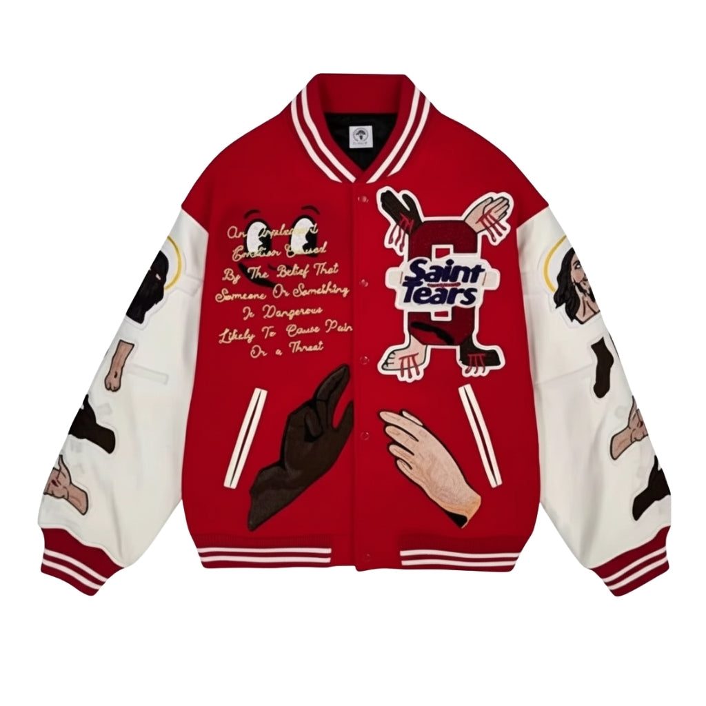 Maak een statement met deze unieke rode collage varsity jacket. De opvallende geborduurde handen, kunstzinnige patches en de grote “Saint Tears” letter maken van deze jas een echte eye-catcher. De contrasterende witte mouwen en de gestreepte boorden geven een klassieke college-look.