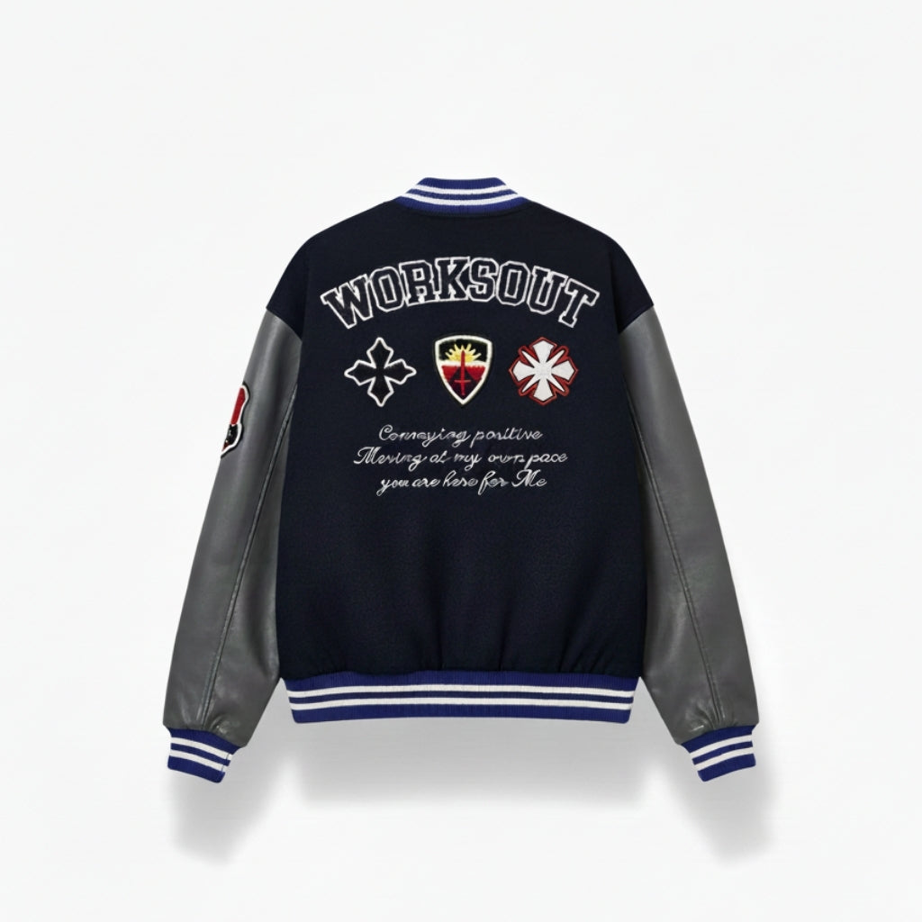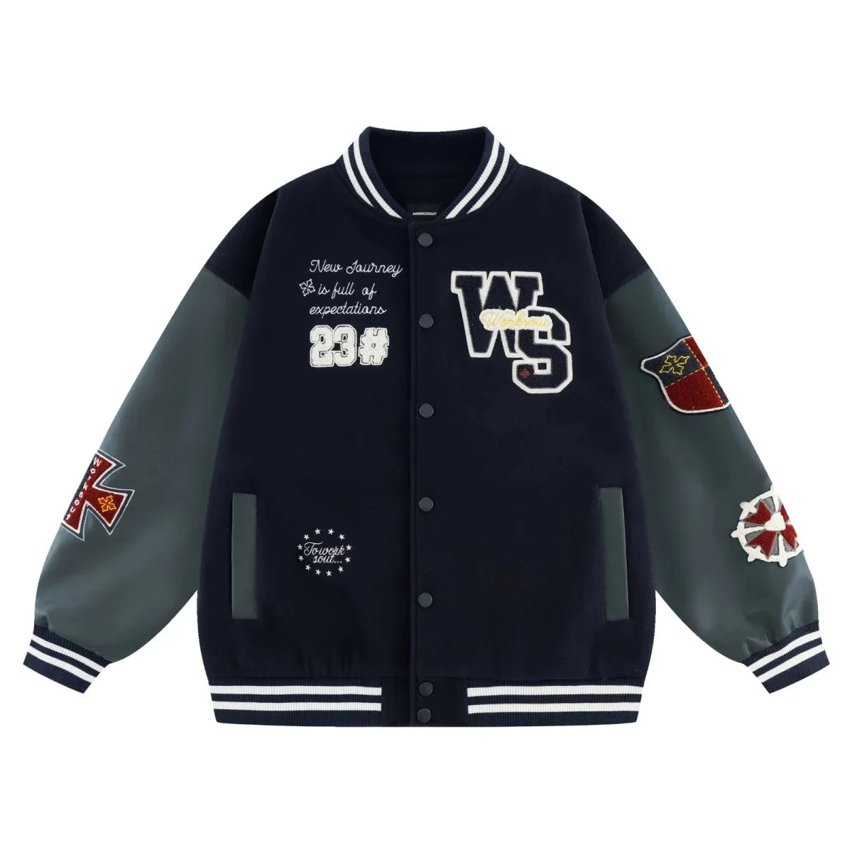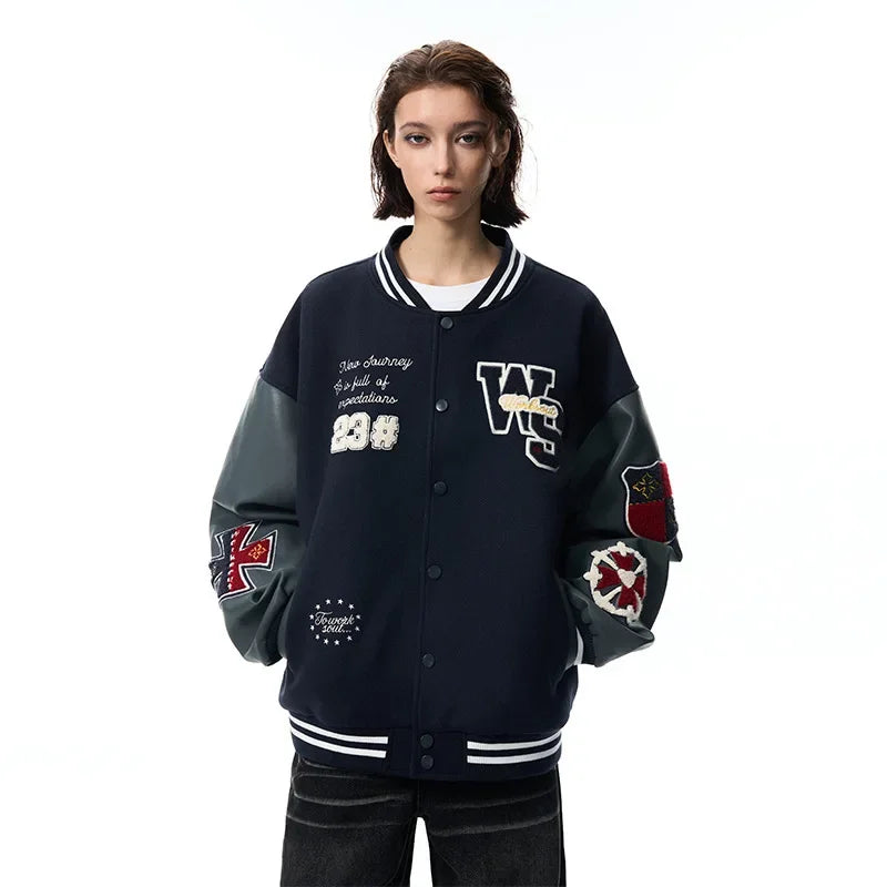 Maak je look compleet met deze donkerblauwe varsity jacket met contrasterende grijze mouwen en opvallende patches. De geborduurde details en retro college-letters geven de jas een uitgesproken vintage uitstraling, terwijl de losse pasvorm zorgt voor optimaal comfort. Perfect voor casual dagen, streetwear outfits of om een sportieve twist toe te voegen aan je dagelijkse stijl.