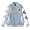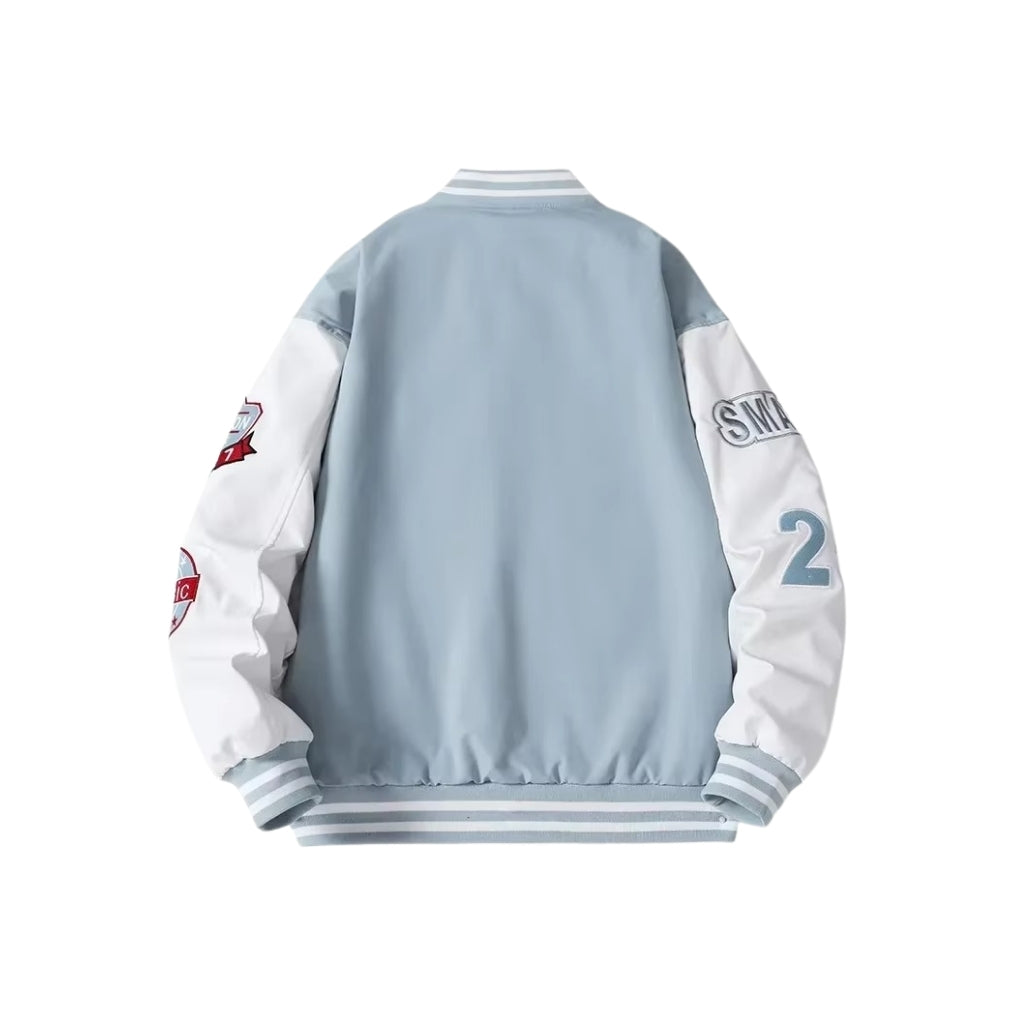 Breng kleur in je outfit met deze lichtblauwe varsity jacket. De grote letters, geborduurde sportpatches en contrasterende witte mouwen zorgen voor een frisse en opvallende look. De gestreepte boorden en klassieke drukknoopsluiting geven de jas die authentieke college-uitstraling.